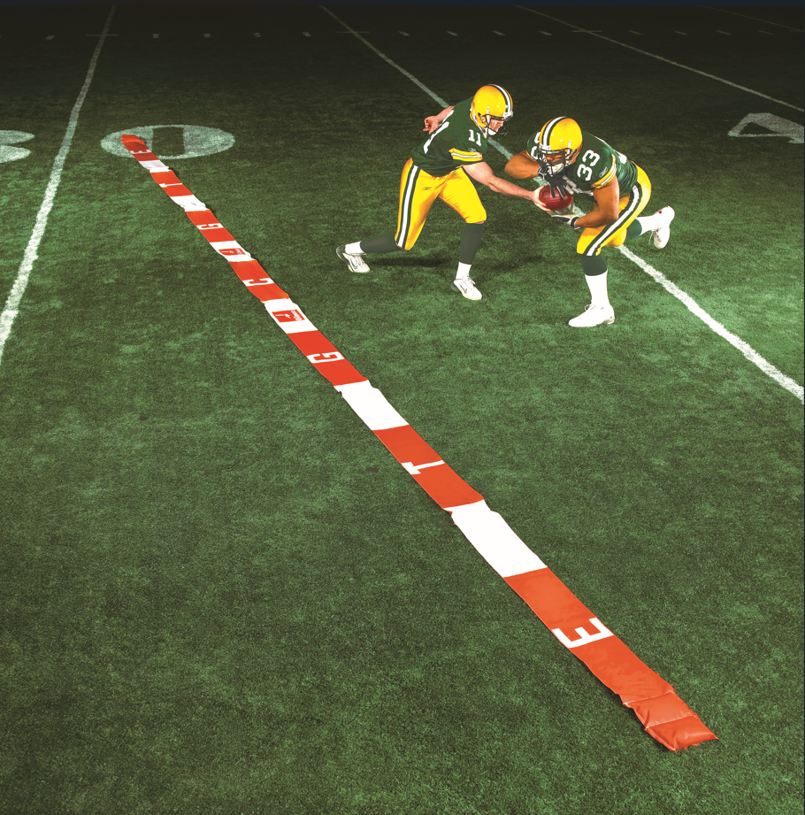 The GUIDEBACK marks the splits for the O-line and the points of attack for the Backs. Sand weighted. Available in a custom length or in a stock length of 35′ with 2′ splits and 3′ player positions. Please call office to order custom guidebacks at 1-800-243-0398.